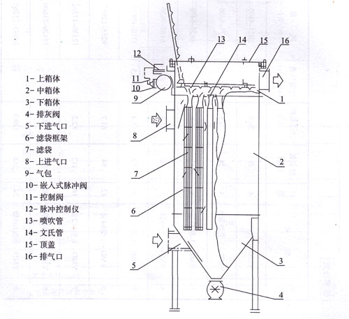 含塵氣體由進(jìn)氣口進(jìn)入箱體,通過(guò)濾袋得以凈化,凈氣孔經(jīng)文氏管進(jìn)入上箱體,從排氣口排出,濾袋外表面粉塵不斷增加,使除塵器阻力增 大,為使設(shè)備阻力維持在一定范圍,要清除濾袋表面的灰塵,清灰時(shí)由控制儀定期順序觸發(fā)各控制閥,開(kāi)啟嵌入式脈沖閥,使氣包內(nèi)壓縮空氣由噴吹管上的噴嘴噴出 (一次風(fēng)),通過(guò)文氏管誘導(dǎo)數(shù)倍于一次風(fēng)的周圍空氣(二次風(fēng))進(jìn)入濾袋,在瞬間產(chǎn)生振動(dòng)波與逆向氣流,抖下粉塵,落入下箱體,經(jīng)排風(fēng)閥排出機(jī)體。在清灰過(guò)程中,每次噴吹時(shí)間稱脈沖寬度,一般僅0.1-0.2秒,全部濾袋完成一個(gè)清灰循環(huán)的時(shí)間為脈沖周期。