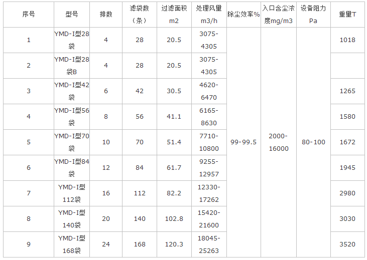 YMD-Ⅰ型低壓噴吹脈沖袋式除塵器技術(shù)性能: